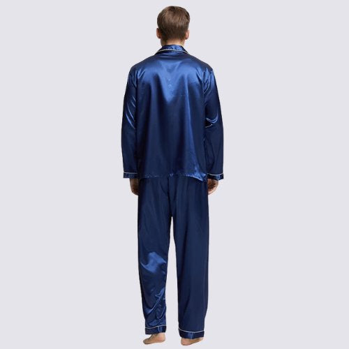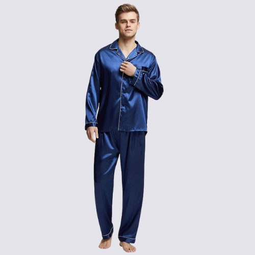 The Mason Royal Blue Satin Pajamas stand out with their deep royal-blue shade and clean, elegant lines. The button-up top and straight-leg pants create a balanced look that feels relaxed yet polished. Designed for both women and men who value style at home, this set naturally fits into calm evenings and slow mornings, offering a refined presence without effort.