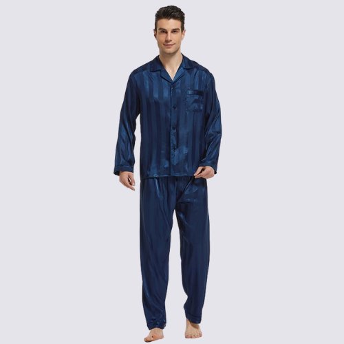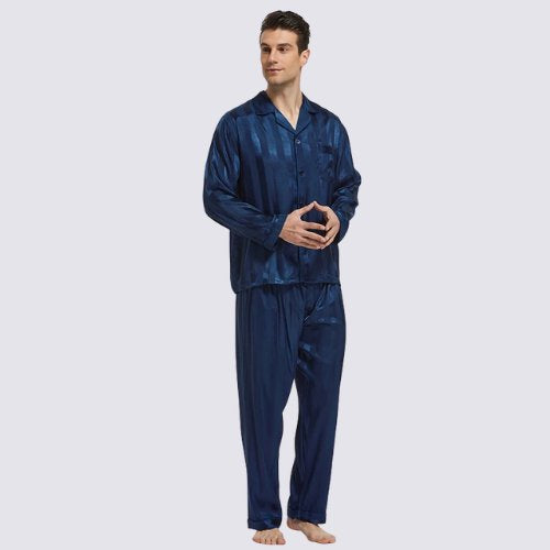 The Zane Satin Pajama Set stands out with its deep blue tone and subtle striped sheen. Designed with a relaxed button-up top and flowing pants, it creates a balanced silhouette that feels modern and confident. This set naturally fits into evenings and mornings at home, offering a refined appearance without ever feeling restrictive or formal.