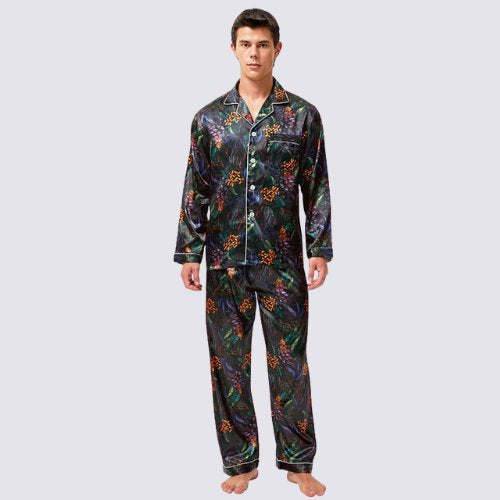 The Niko Satin Pajamas stand out with their artistic print, fluid lines, and relaxed silhouette. This satin set balances presence and ease, offering a refined look that feels expressive without effort. Designed for evenings, nights, and slow mornings, it naturally adapts to everyday moments at home.