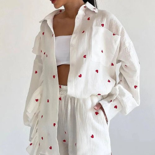 The Heart Cotton Short Pajama Set brings a refreshing blend of softness and subtle sophistication to your cocooning moments. The crisp white fabric paired with tiny red or black hearts creates a playful yet refined look, while the loose shirt and flowing shorts offer a naturally graceful silhouette perfect for unwinding with style.